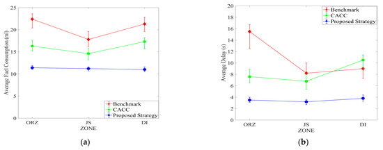 Figure 10 shows average fuel consumption and delays in each zone for different control scenarios under medium traffic demands. The results are calculated based on the same vehicle arrival situation as described in Figure 7, Figure 8 and Figure 9. The proposed strategy performs better than the other two strategies in each zone in terms of fuel consumption and delays. As show in Figure 10a, the average fuel consumption per second for each vehicle optimized by the proposed strategy in the three zones is almost the same, and both are kept lower. That further means that vehicles can drive through each zone smoothly. To sum up, the proposed strategy reduces average fuel consumption by 37.1–49.1% in different zones compared to the benchmark and by 23.3–36.4% compared to CACC. Moreover, Figure 10b also indicates that vehicles can drive through each zone more quickly under the proposed strategy than under other strategies. The proposed strategy reduces average delays by 57.8–77.4% in different zones compared to the benchmark and by 52.9–63.8% compared to CACC.