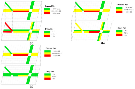 The influence on the delay of the three strategies for the road network: (a) benchmark; (b) CACC; and (c) proposed strategy.
