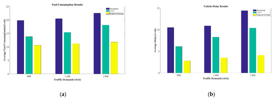 Comparison results of fuel consumption and vehicle delay under different demands: (a) fuel consumption and (b) delay.