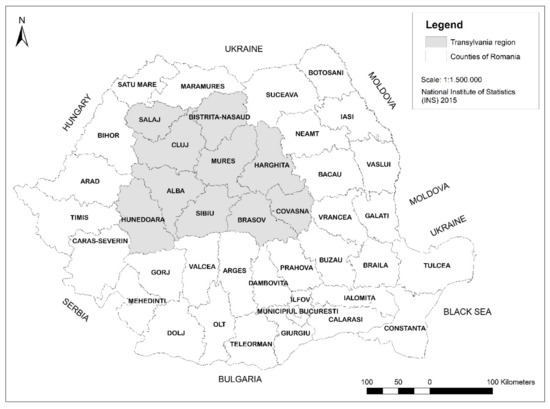 Our case study is the urban settlements from Transylvania counties, a historical region known as “the land beyond the forest” located in the Central part of Romania, surrounded by the Carpathian Mountains. The field investigations focused on urban settlements from Transylvania counties, represented by the cities from 10 counties as follows: Alba, Bistrița-Năsăud, Brașov, Cluj, Covasna, Harghita, Hunedoara, Mureș, Sălaj, and Sibiu. The field investigations were based on the hypothesis of the Central Agency of Regional Development (ADRC 2010) according to which the ageing process of population is preeminent in the central part of the region [46].