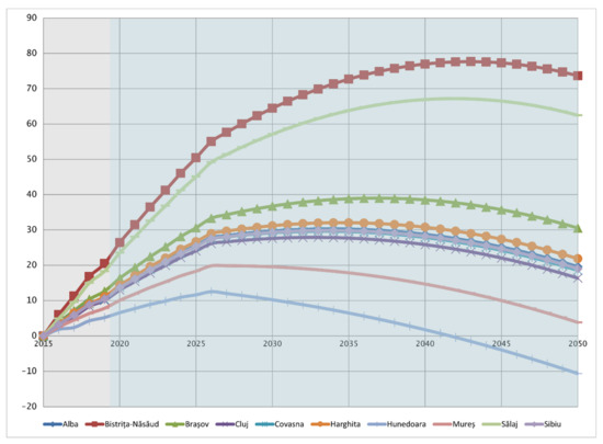 A more optimistic prognostic ranging from 20% and up to 40%, in the interval 2020–2050 is visible in urban areas of counties Covasna, Cluj, Sibiu, Alba, Harghita and Brașov. In urban area of Harghita the share of older adult people increases from 14.31% in 2020 up to 21.83% in 2050. Also, an important growth of older adult people from 16.30% in 2020 and up to 30.50% in 2050 is counted in urban area of Brașov County. This intermediate area of growth (20–40%) of the older adult population is considered a constant growth due to the extension of this age group segment.