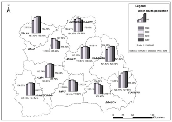 The first one sustains the general increasing tendency regarding the older adult people due to the raise of life expectancy and spreading effects of ageing process since around 2025–2030. The prediction of the older adult population aged 60–65+ years has an outstanding growth trend for this first interval for a few counties as Alba, Cluj, Covasna, Harghita, and Brașov.