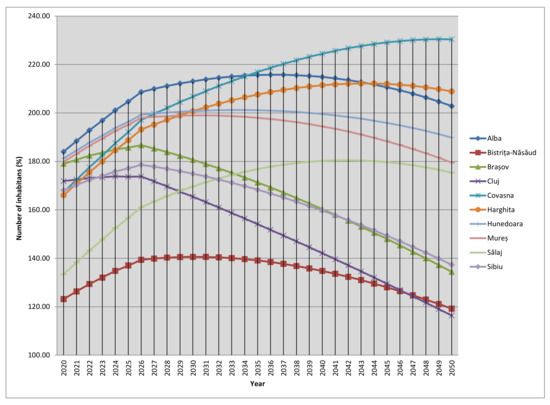 During the communist period and after the fall of this regime, the demographic decline was accentuated by external migration, reaching high values in the 2000s, when a large rate of emigration within young and unemployed people was observed [41]. The rural exodus manifested in rural emigration was followed by an urban emigration outlined by the movement of target population groups from small to medium-sized towns, and finally to large cities with higher economic, social, and cultural benefits. On top of the internal population movements, an even larger impact was caused by external migration [41]. In the last thirty-one years, the population dynamics in Transylvania can be described by low birth rates and the increase of the older adult population, leading to progressive demographic decline. Additionally, the lack of proper social policies and the emigration of young people accentuated the phenomenon [42].