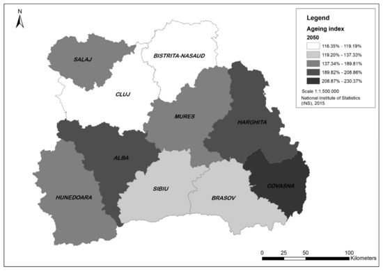 The Transylvania region is currently facing the complex social and economic consequences of an ageing population process and deterioration of all demographic structures. The accelerated ageing process of the population refers to the numerical increase of the segment of the older adult population aged 60–65 years and above from the total population because of the decrease in the fertility and mortality rate conceded by the increase in life expectancy [52]. The population ageing reached high values after 1992, marking a demographic transition from the traditional reproduction model with a high birth and mortality rates to the post-communist model represented by low birth rates and moderate mortality rates [43].
