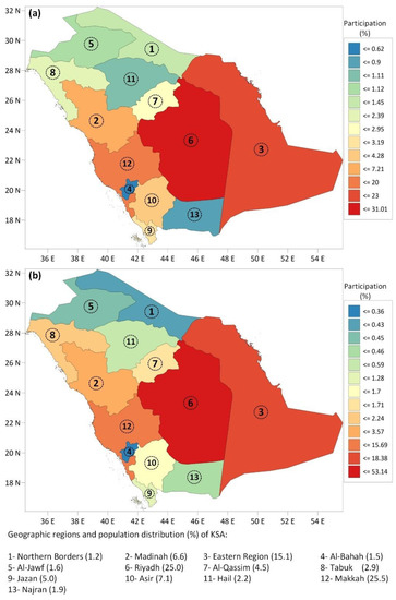 Individuals from thirteen provinces of KSA were invited to the survey, while representativeness of respondents based on the KSA’s population were targeted. The province-wise geographic distribution of participation rates was visualized by using the QGIS software (ver. 3.16) in Figure 1. The Pearson’s correlation coefficient between the participation rates and population distribution of provinces based on the latest census data [19] was computed as 0.90, indicating a positively strong correlation and proportional participation from provinces compared to the population distribution of the KSA. The highest participation was provided from the Riyadh province, with a rate of 41.8%, which was followed by the Eastern (21.2%) and Makkah (17.9%) provinces.
