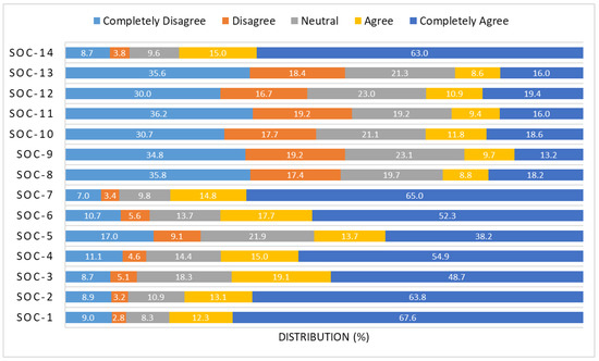 In general, the frequency behavior of the statements in the social-impact category typically fits the normal distribution. On the other hand, frequency distributions of SOC-1, SOC-2, SOC-3, SOC-4, SOC-6, SOC-7, and SOC-14 statements slightly skewed to the left due to their negative skewness values ranged from −1.02 to −2.50, which could be attributed to the highly clustered scores between 4 and 5 (agree/completely agree). For the same statements mentioned above, the kurtosis values of Wave II are higher than those of Wave I. Kurtosis values of SOC-1, SOC-2, SOC-7, and SOC-14 are greater than 3 and fit the leptokurtic type of kurtosis. This type of distribution is because of highly grouped scores between 4 and 5 and low standard deviation values. These frequency distribution interpretations reveal that SOC-1, SOC-2, SOC-3, SOC-4, SOC-6, SOC-7, and SOC-14 statements received outnumbered higher scores in Wave II, implying that the start of women driving has contributed positively to social attitudes of the KSA.