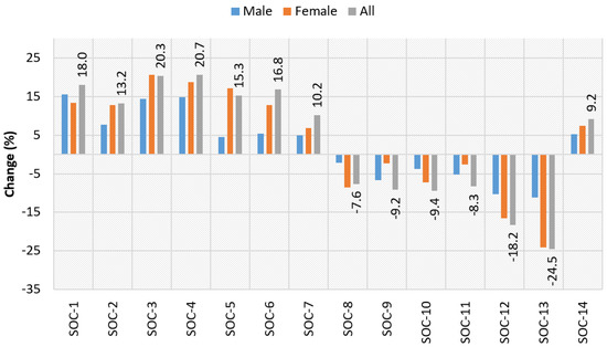 The effect of lifting the ban on women to drive on the attitudes towards the social impact was also investigated by comparing the results of Wave I and Wave II. Differences between response scores calculated for Wave I and Wave II are shown in Figure 3. It can be inferred from the comparison results that putting women driving into practice has positively affected attitudes towards the social impact due to increased agreement rates on positive statements and disagreement rates on negative statements as well. The most significant change was observed for SOC-13 (−24.5%), which was followed by SOC-4 (20.7%) and SOC-3 (20.3%) statements. The doubts on possible traffic harassment on women drivers have been relieved, as the KSA has enacted stringent penalties to protect women drivers against harassers and the experienced respectful behavior shown for women drivers. As the number of women drivers has increased and women adapted to being a part of traffic mobility, families have been more supportive of their women members driving, and the idea of women driving has become more socially acceptable, based on the results of Wave II.