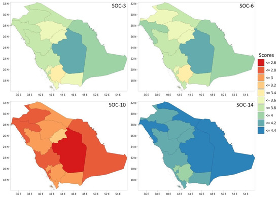 Geographic distribution of average responses for social-impact clusters: SOC-3, SOC-6, SOC-10, and SOC 14.