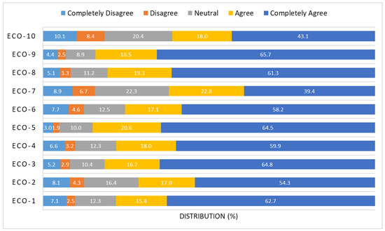 Figure 6 represents the distribution of the whole survey results (Wave I and Wave II) regarding the response options given on a Likert-type scale ranging from 1 (completely disagree) to 5 (completely agree). All statements on women driving in the economic impact category received high agreement rates (agree + completely agree), fluctuating between 61.1% and 85.1%. Respondents agreed the most with a rate greater than 80% on four statements: (i) “ECO-3—Women driving might reduce the volume of international labor remittances”, (ii) “ECO-5—Women driving might increase car sales of car dealerships in the Kingdom for certain types”, (iii) “ECO-8—Women driving might reduce the number of private drivers in the Kingdom”, and (iv) “ECO-9—Women driving might create new female job opportunities”.