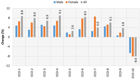The effect of ending the ban on women driving on attitudes towards the environment was examined by comparing the results of Wave I and Wave II. Differences between response scores calculated for Wave I and Wave II are shown in Figure 11. The average response scores of ENV-1 and ENV-2 statements in Wave II decreased by 14.7% and 17.3%, respectively. These changes signify that participants’ doubts on the availability of infrastructure supporting women driving and the contribution of women driving to environmental pollution had been eased after putting women driving into practice. The respondent’s perception on the statement “ENV-3—Driving would increase the number of electric cars in the Kingdom” did not change significantly according to the Wave I.