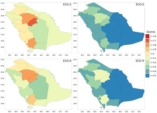 Geographic distribution of average responses for economic impact clusters: ECO-2, ECO-5, ECO-6, and ECO-9.