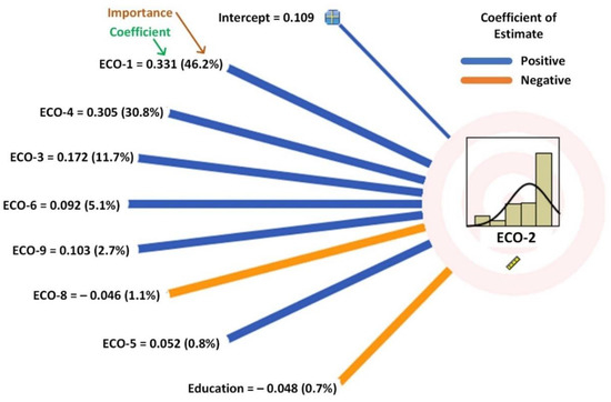 All sociodemographic parameters and statements of the economic category were specified as predictors to model target indicatory statements of ECO-2, ECO-5, ECO-6, and ECO-9 during the automatic linear modeling. Prediction accuracies of linear models targeting ECO-2, ECO-5, ECO-6, and ECO-9 were computed to be 60.0%, 34.9%, 45.5%, and 55.3, respectively. Figure 9 indicates coefficients and percent importance of predictors and the intercept of the best performing model “ECO-2”. The ECO-2 model is best explained by ECO-1 statement with 46.2% of importance, followed by ECO-4 (30.8%) and ECO-3 (11.7%). The total importance of the remaining predictors on the model is found to be 10.4%. The ECO-2 model results explain that the contribution potential of women driving to the achievement of sustainability and Vision 2030 objectives, increasing women empowerment, and decreasing international labor remittances are driving factors for increasing income rates in the KSA.