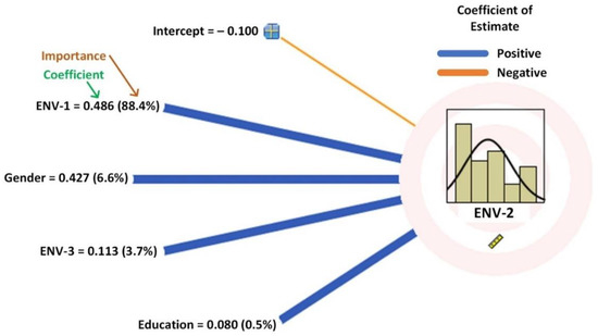 Statements of the environmental impact category were modeled using the automatic linear modeling. All sociodemographic parameters and statements in the environmental category were selected as predictors to model the target statement. Prediction accuracies of linear models targeting ENV-1, ENV-2, and ENV-3 statements were found to be 29.0%%, 31.5%, and 4.2%, respectively. Figure 13 shows coefficients and percent importance of predictors and the intercept of the best performing model “ENV-2”. The ENV-2 model is explained best by the ENV-1 statement with 88.4% of importance, which is followed by gender (6.6%), ENV-3 (3.7%), and education (0.5%) predictors. It is noteworthy to mention that the model accuracies of environmental impact models are remarkably lower than those of social and economic impact models developed in this study. This could be attributed to the limited availability of predictors in environmental impact models compared to other models.