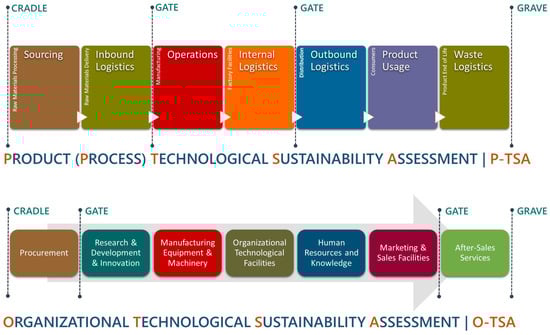 The unit of analysis in the first approach is the functional unit that defines the product system to be analyzed, while in the second approach is the organization under study. Adapting the activities categories defined by Porter [99] to describe the value chain of a business, as already done in other recent studies [100], the pattern of possible system boundaries (cradle-to-gate and gate-to-grave) was drawn (Figure 1) for the assessment of the technological sustainability of the product process (P-TSA) or organization (O-TSA).