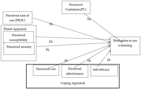 Based on these appraisals, they decide which coping appraisal to use to reduce the threat. The key consideration of TTAT is to identify the mirror of user perceptions, motivations, and behaviors during the time of threat avoidance behavior. According to TTAT, users will avoid a social medial application if they believe that the social medial application is a threat and can be avoided by applying a coping appraisal. TTAT suggests that users’ threat perceptions are determined by the perceived probability of the threat’s occurrence and the perceived severity of the threat’s negative outcome [26]. Literature provided evidence TTAT could be integrated with other relevant theoretical frameworks or antecedent variables to give an in-depth understanding of behavior practices [26]. TTAT will offer a comprehensive theoretical underpinning to understand students’ concerns regarding risk appraisal in terms of using e-learning with a social medial platform and comprehensively interpret student’s threat avoidance behavior. We consider that student’s motivation to use e-learning is considered as a coping assessment. Further, we believe that TTAT constructs (threat and coping appraisal) can extensively assess the formation of appraisal of external coping as the basic precondition of TTAT is how a student reacts when a student perceives a threat in terms of using e-learning threat. Thus, taken together, we argue both models that TAM and TTAT can have an impact on students’ tendency to use e-learning applications. For example, using e-learning applications could be considered threatening to one’s beliefs and moral principles. A student may thus foresee such threats and refrain from using the application to avoid post-motivation behavior. Therefore, we proposed a comprehensive research model incorporating TAM and TTAT to explore students’ motivation to use e-learning to fulfil the purpose of the current study.