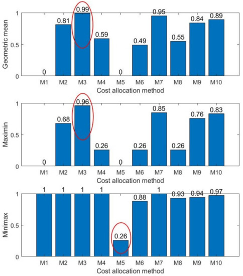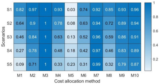 - The selection of the cost allocation method considers stakeholders involved in cost allocation in ICESs, which addresses the multi-group decision-making environment in the real world. It is useful for local energy system designers, local community members, and investors that participate in the ICES. Furthermore, the approach is generic, indicating that other than the example considered in this paper, the MCDM approach for the selection of cost allocation method is able to apply in different communities considering their preferences with minor adjustments on a case-by-case basis.