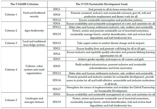 Criterion 1: Food and livelihood security. Sustainable agricultural systems for food production and economic activities for rural livelihoods and decent jobs in GIAHS sites are linked to the SDG1 and SDG8 [14]; and encouraging the sustainable consumption and food production of GIAHS is relevant to the SDG12 [15].