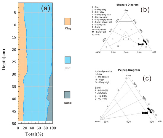 (a) Vertical variation of sediment grain-size contents and the lithology classification of Balkhash Lake: (b) Shepard diagram and (c) Pejrup diagram.