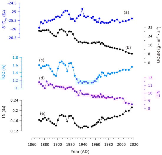 Figure 3 shows the strong fluctuation from 1870 to 1920. There was also a marked decrease during the 1920s. Figure 3 reveals that there has been a gradual increase since the 1970s. There was a marked similarity between TOC and TN, and they were significantly correlated (r = 0.76, p < 0.001). The δ13Corg values varied from −24.84 to −25.93‰. The graph shows a steady increase from 1870 to 1920. From 1920 to 1940, the change in organic carbon isotopes showed an obvious V-shape, and the lowest value appeared in 1930. Starting in 1940, the organic carbon isotopic values decreased until 1980, and there has been a slight increase since 1980. The minimum value of molar ratio of carbon and nitrogen (C/N) in the sediments of Lake Balkhash appeared at the top of the core. From the perspective of the changes over the past 150 years, the OCBR continues to decline, and the minimum appears at the top of the core.