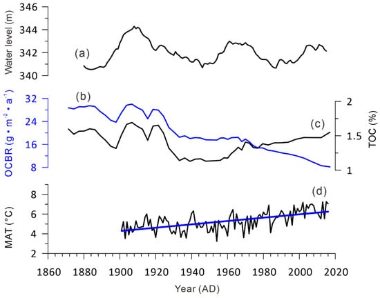 For arid regions, the content of organic carbon with terrigenous sources in lake sediments indirectly reflects aridity and humidity variation [37,48,49]. The above-mentioned studies have found that lake aquatic organisms are the main sources in the core sediments of Lake Balkhash, which was consistent with large lakes such as Qinghai Lake [50] and Bosten Lake [46] but was significantly different from some shallow lakes [51]. The influencing factors on organic matter in the core sediments of Lake Balkhash seemed to be very different. For lakes in arid climate backgrounds, the change in water salinity is the main limiting factor affecting lake productivity [52]. Correspondingly, the main factor affecting the primary productivity of lakes in humid areas is the change in nutrients [53,54,55]. Judging from existing studies on the water level and salinity of lakes in arid areas [56,57], the change in lake water level is negatively correlated with the change in salinity; for example, when the water level of Lake Balkhash declined, the abundance of planktonic species decreased, and the lake became more saline [25]. Therefore, the change in organic matter content in the core sediment of Lake Balkhash may reflect the variation in the lake water level. Generally, the organic carbon content will increase with the increase in water depth, indicating that the water depth increases and the oxygen content decreases are more conducive to the preservation of organic carbon. In the historical period, i.e., in the two periods (1900–1920 and the 1960s) with the highest water levels in Balkhash Lake, the OCBR in sediments also responded (Figure 4), reflecting the response of the lake water environment to lake primary productivity. The increase in the lake level may also have led to a decrease in oxygen in the bottom water, which is conducive to organic carbon sequestration, and the efficiency of organic carbon burial may have been higher [58]. However, the correlation between the two curves was not significant.