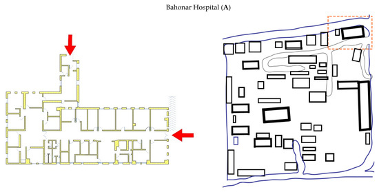 Data were collected from March to May 2020. Due to the large number of patients affected by the pandemic, there was no specific hospital for admitting these patients, and they were distributed among different public and private hospitals. All four hospital plans were different in terms of layout, space configuration, and the number of floors. The selected hospitals are representative of typical hospital plans in Iran. Bahonar Hospital (A) has several single and double-story linear plan buildings scattered in the hospital yard, Afzalipour Hospital (B) shares a multi-story clustered plan, Mehregan Hospital (C) is a linear multi-story building, and Payambar Azam Hospital (D) covers a square multi-story plan. Figure 2 shows the layouts of the selected hospitals in Kerman.