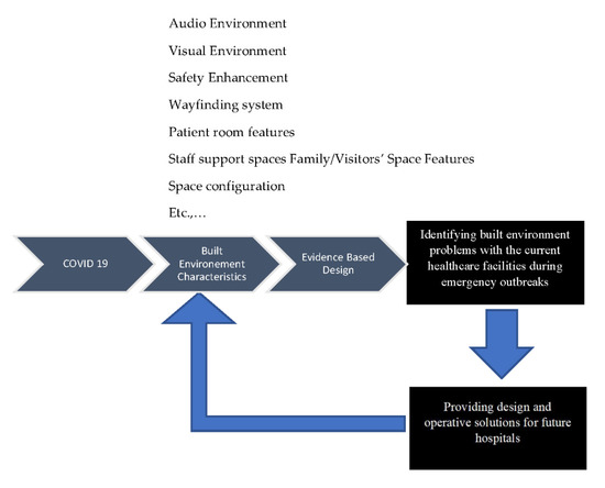In this study, we attempted to shed light on health care environment contradictions in terms of infection control during a pandemic while focusing on the experiences of health care workers. In the battle against COVID-19, frontline hospital staff are in direct contact with patients and have a better understanding of the shortcomings of health care environments. The current study applied an evidence-based design approach. Nowadays, health care design is increasingly guided by rigorous research linking the physical environment of hospitals to patient and staff outcomes. Health care design is moving toward “evidence-based design” to enhance design decisions for a planned environment [41,42]. EBD in health care environments indicates a significant relationship between the built environment and health-related outcomes. These include the reduction of medical errors (including nosocomial/ hospital-acquired infections), the reduction of stress (and injuries) on the medical staff, and improved patients healing [24,36,42].