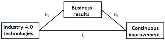 The combined effect of technology 4.0 and continuous improvement appears to achieve better results in organizations. Mesa and Carreño [8], Torrent-Sellens [42] and Blanco et al. [43], among others, suggested in their studies that that the implementation of 4.0 technologies causes typical effects of continuous improvement, such as improving the quality of processes, and that all this translates into improved results. Our study is a proof of the relationship between 4.0 technologies, continuous improvement, and business results. All these points allow researchers to continue deepening the direct relationships between Industry 4.0 and continuous improvement, allowing the formulation of new hypotheses based on the hypotheses validated in this work.