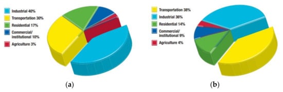 Figure 1. (a) Secondary energy use by sector [62,63]. (b) GHG Emission by sector [62,63].