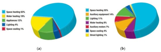 Figure 2. (a) Distribution of residential energy use by end use [62,63]. (b) Commercial/Institutional energy use by end use [62,63].