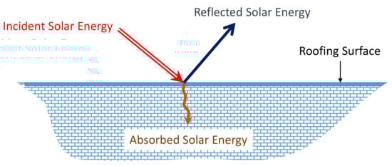 Generally, the external surfaces of different types of roof systems (traditional, green and cool) are exposed to several environmental factors that include dust/dirt, cloud coverage, sunlight, rain, snow, wind, outdoor temperature and relative humidity. The performance of the roofs depends mainly on these factors and the roof specifications [6,14,15,16,17,29]. The absorbed solar radiation on the external surfaces of the roofing systems causes an increase in the surface temperature of the roof, thereby increasing the cooling load in summer and reducing the heating load in winter [30]. Unlike traditional roofing systems, both green roofs and cool roofs are designed to reduce the amount of absorbed solar radiation. The cool roofs, which are the focus of this paper, use reflective materials or coatings that have high short-wave solar reflectivity (i.e., low short-wave absorption coefficient) to reflect a substantial portion of the incident solar radiation.