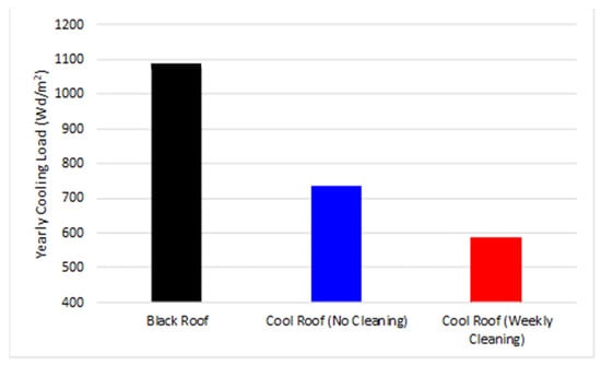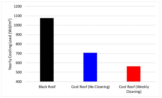 Figure 5. Comparison of the yearly cooling energy load of conventional/black roof and white roof based on no cleaning condition and weekly cleaning condition and subjected to Saudi Eastern Province climates [71,72].