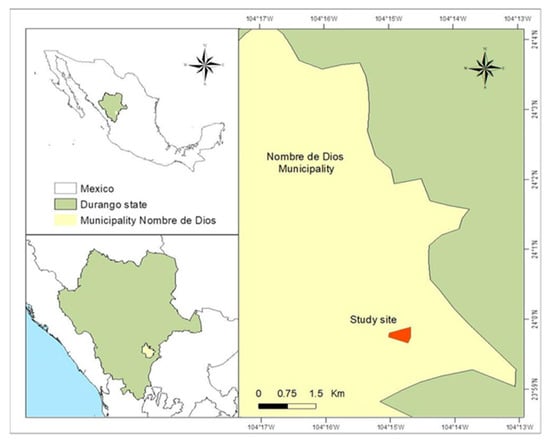 The experiment was carried out in an agricultural plot located 5 km from the town of San José de Tuitán in the municipality of Nombre de Dios, Durango, Mexico, which is 60 km southeast of the city of Durango. The site is located at the geographic coordinates of 23° 59′ 53.35″ N and 104° 14′ 41.04″ W and at an altitude of 1872 m (Figure 1).
