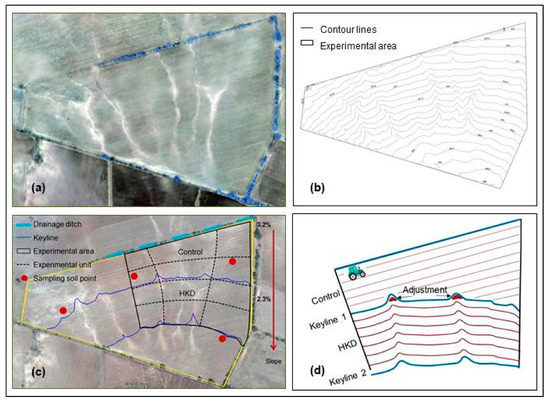 To implement the HKD, a survey of the plot was first carried out to identify how it received water from both runoff and precipitation (Figure 3a,b) and thereby distribute the water throughout the land and try to meet the crop’s needs. The design was applied to the plot’s total area, but only 7.0 ha were used for the experimental area (Figure 3c).