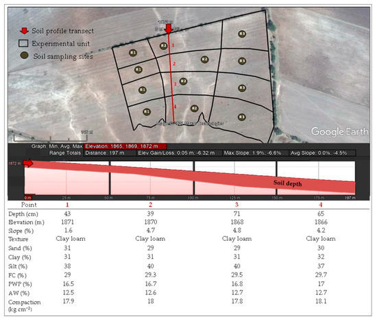 The experimental plot has a total area of 15.36 ha with an average slope of 2.8%, Kastanozem-type soil, and igneous rock [12]. The use of the land is for rainfed agriculture.
