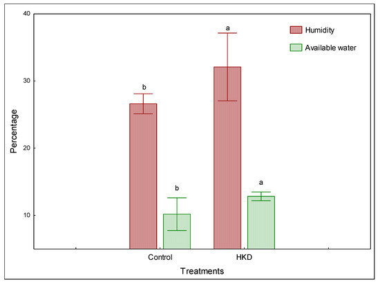 Similarly, the available water showed statistically significant differences (p < 0.05) between the treatments, where the HKD had 13% surpassed the control that had a 10%.