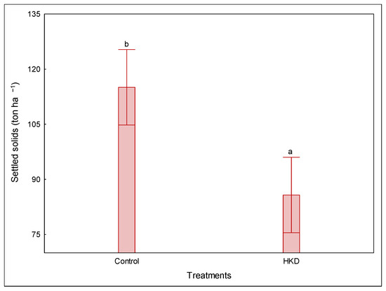 Significant differences (p < 0.05, Figure 6) in erosion were observed between treatments. The HKD resulted in less transported solids (86 ± 23 ton ha−1) than the control (115 ± 23 ton ha−1).