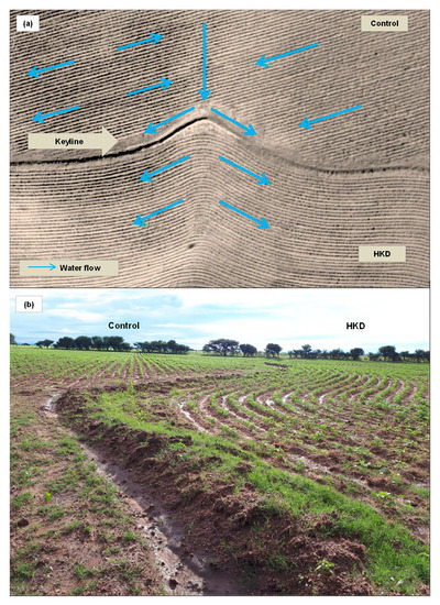 The HKD is intended to reduce surface runoff, increase infiltration, and conduct-low velocity water from gullies to ridges, which are managed according to the slope with which the keylines are designed. These practices should be followed as a guide to trace the land’s tillage pattern (furrows) in a progressive manner both above and below the keyline [11].