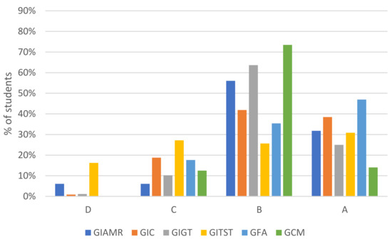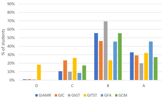 Distribution of marks for each school are shown in Figure 2. In all the Bachelor’s degrees, except GITST, the predominant grade is B, followed by A. It is remarkable that GITST has a wider distribution than other degrees, with a high percentage of D and C grades. It must be mentioned that, in GITST, students who did not submit their activities received a D mark, while in the other degrees they were qualified as absent, with no grade.