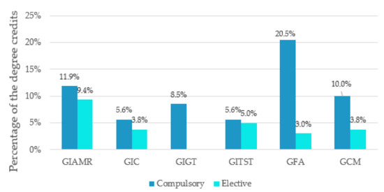 All Bachelor’s degrees develop this CCLO in a number of subjects proportional to the total number of subjects in each educational program. However, if expressed in terms of credits (Figure 5), greater differences are observed. The case of GFA is noteworthy, where the outcome is developed and evaluated for 20.5% of the compulsory credits of the degree, while in other bachelor’s degrees the outcome is treated in subjects that represent just over 5% of their credits.