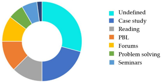 The specific description of the activities to be carried out for the acquisition of the CC07 is uneven, with a high number of subjects detected (27.45%) that do not describe them in detail. GITST stands out positively, where all subjects describe activities in a concrete way, while in GFA only half are described. Among the most common activities, one can mention the case study, used in 19.61% of subjects, followed by project-based learning and reading, both used in 11.76% of subjects (Figure 6). There is a very strong correlation between some methodologies and the particular Bachelor’s degree. This is the case for project-based learning, which is used in five out of eight courses working this CC07 in GFA. However, this methodology is only used in one of the subjects of the other bachelor’s degrees analyzed.