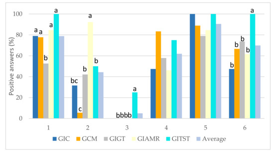 Figure 9 presents the response given by the students to the first questionnaire for each bachelor’s degree. Most of the students (79%) know about the UPV CCLO Institutional Project; GIGT students indicated a lower knowledge (p ≤ 0.05) than the other degrees, which did not otherwise show differences. However, that level of knowledge drops when related to acquisition levels, when only 44% of the interviewed students indicated that they knew the differences between the levels to be reached; the GIAMR students showed the highest knowledge (p ≤ 0.05) regarding this point. Once the meaning of the acquisition levels was re-explained to students, 91% stated that they understood them perfectly, with no statistical differences between degrees.