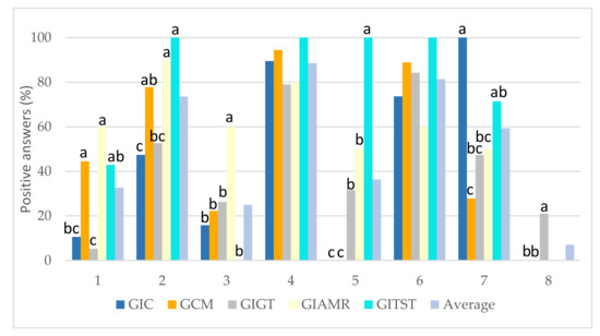 Students’ responses (presented as percentage of affirmative responses) to the development of the outcome “Ethical, environmental, and professional responsibility” CC07 within each degree: awareness of being evaluated, in all the subjects (1) and in any subject (2); activities developed to help to reach the acquisition level (3); application of this responsibility in professional life (4); qualification knowledge (5), willingness to increase the development of this outcome in the curriculum (6); activities to develop the outcome prior to be evaluated (7); outcome development was supposed as an extra work overload (8). For each question, different letters above each column indicate significant differences (p ≤ 0.05) among degrees, ranging from a (maximum) to c (minimum). The absence of a letter above the columns indicates that there are no significant differences (p ≤ 0.05) among degrees for the corresponding question. Questions 7 and 8 were not answered by the GIAMR and GITST students. The corresponding F-ratio for each question is: 4.85, 3.31, 2.67, 0.90, 17.90, 1.52, 7.47, 4.67. Source: Prepared by the authors.