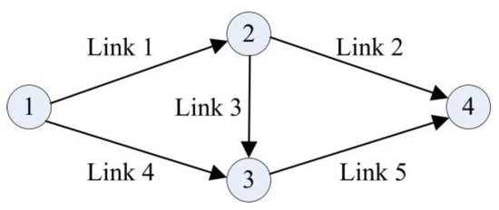 - Stage 5: Route flow updating. Detect the direction of search () and the step size () judging from the present values, and the flow of route is updated as the rule , and go the Stage 2. Set the direction of search as , where is called as auxiliary flow. If , with being the number of routes that have the maximum value of ToMaRUs in step for pair , and otherwise, is 0. The step size is set as .