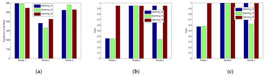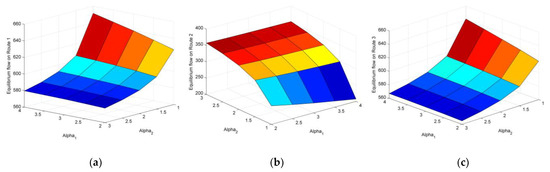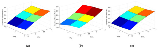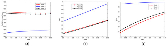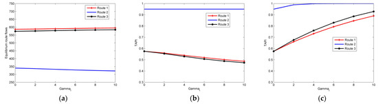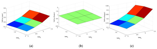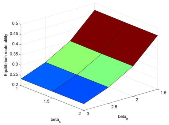 - The equilibrium route utility changes when the values of the three targets, the relative importance between different target achievements, and the target interaction change. From our testing, travelers’ larger acceptable expense and stronger extent of risk-averse attitude leads to the larger equilibrium route utility, but the allowable delay of the company has almost no impact on this. When the relative significance between the achievements of the target set for travel cost and travel time becomes larger, the equilibrium route utility is larger, but the target interaction, among three targets or between two targets, can decrease the equilibrium route utility.