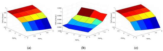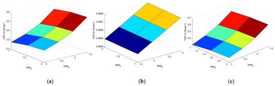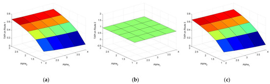 - For some routes, where the target set for travel cost can be successfully reached (depending on travelers’ acceptable expense), target achievement probability for travel time is smaller than travelers’ on-time arrival probability, which means travelers become less risk-averse or even risk-seeking in order to achieve the three targets simultaneously. Meanwhile, on these kinds of routes, target achievement probability for late arrival penalty is also not very large, unless the allowable delay of the company is large; the relative significance between the achievements of the target set for travel cost and travel time is relatively large, or the extent of target interaction among three targets is small. That is, travelers usually bear the risk of violating the allowable delay of the company in order to achieve the three targets simultaneously, unless the aforementioned situations happen.