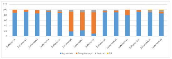 The analysis of opinion statements cannot provide a complete classification of all differences in understanding of forest governance goals among actors. The answers to opinion statements (Supplementary Material 3, Sections 1 and 3) are very similar among respondents: either most of them agree with a given statement, or most of them disagree (Figure 1).