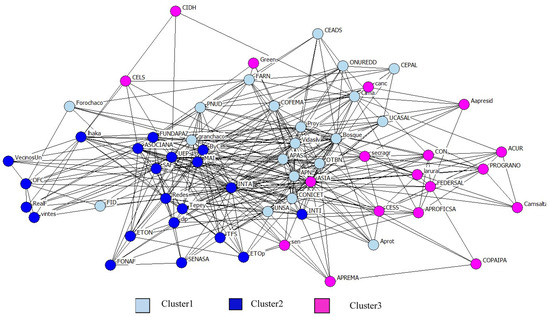 The faction partitioning routine produced three clusters, achieving a fit of 0.711. This statistic indicates that the algorithm-based clustering corresponds fairly well with the observed clustering. Figure 2 shows these clusters in the network. Each actor is represented as a node in the network. Ties between nodes indicate long-term collaboration and policy support for a common goal during policy discussions (see Supplementary Material 3, Sections 2 and 3, Question 3). The different colors represent the three network clusters.