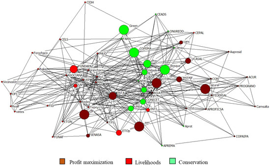 We compared the degree to which the network clusters matched the experts’ classification. There is a high level of congruence for the livelihoods group and a lower level for the conservation group. In the case of the livelihoods group, 78% of the actors classified by the experts were in the same network cluster. In the case of the profit maximization group, 63% were in the same cluster, and for the conservation group, 55% were in the same cluster.