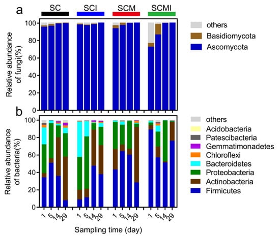 - Neher, D.A.; Weicht, T.R.; Bates, S.T.; Leff, J.W.; Fierer, N. Changes in bacterial and fungal communities across compost recipes, preparation methods, and composting times. PLoS. ONE 2013, 8, e79512. [Google Scholar]