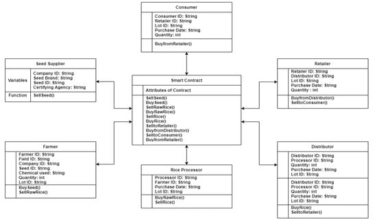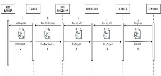 The sequence diagram for the proposed model is shown in Figure 5. This diagram shows the sequence of function execution during the supply chain process of rice from its origin to its delivery to the consumer.
